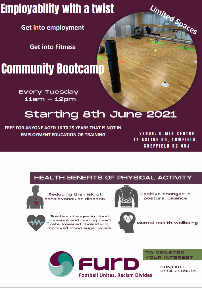 Football Unites, Racism Divides (FURD) is running a Community Bootcamp with employability elements every Tuesday in Sheffield, S2.