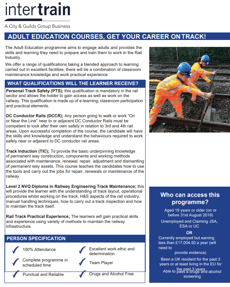 Intertrain is running two 7-week rail training courses at the end of this month for people who are interested in starting a career in the rail industry.