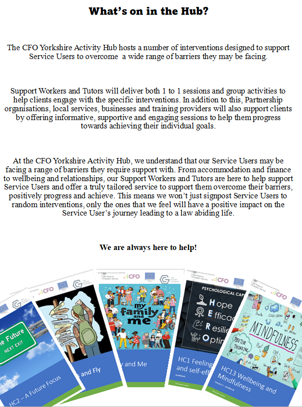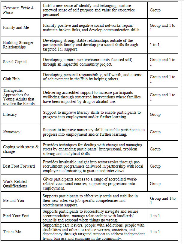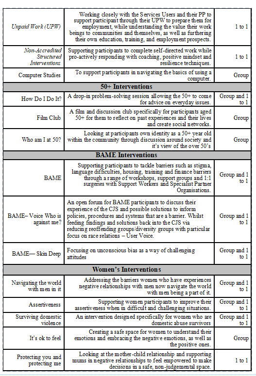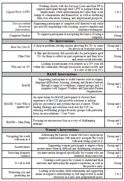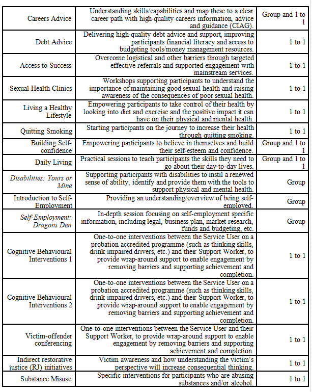 Please see the below Welcome Pack which shows the current list of interventions, with some specialist interventions for BAME, Women and 50+ service users.
