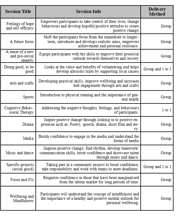 The aim is to improve ex-offenders prospects in the community in terms of employment, life skills, understanding of personal impact, health and confidence.
