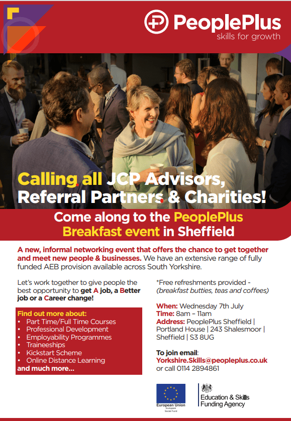 PeoplePlus are hosting an informal breakfast event Wednesday 7th July 8.00-11.00 at their Sheffield venue for JCP, Referral Partners & other companies they work with.
