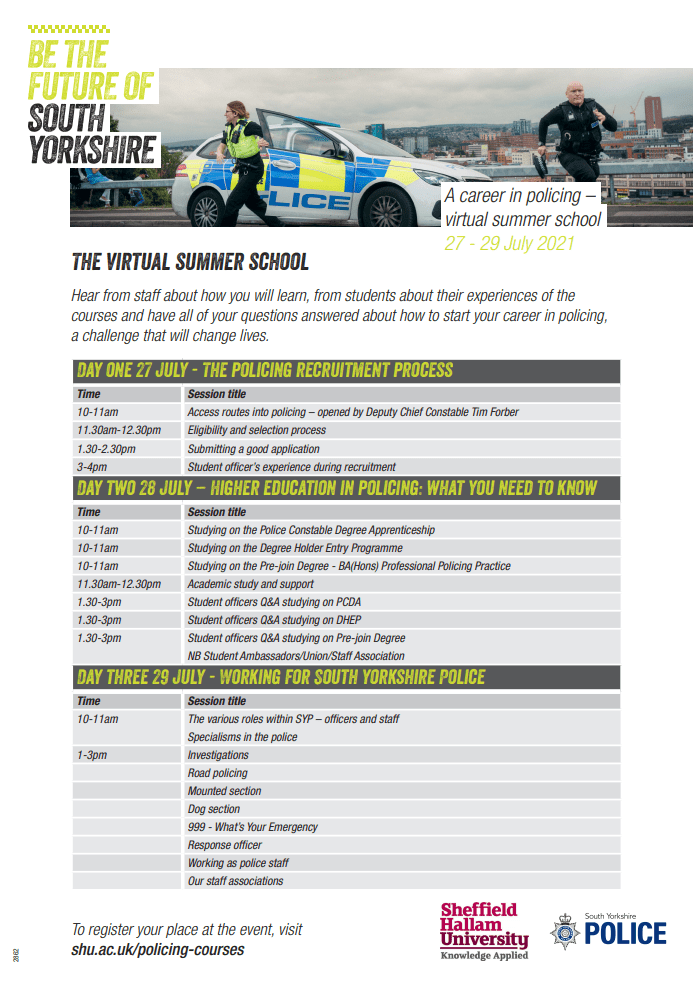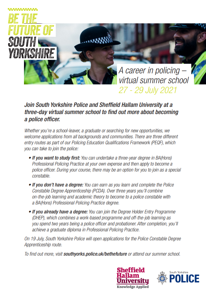 South Yorkshire Police is working with Sheffield Hallam University to deliver a 3-day event at the end of July – the career in Policing virtual summer school.