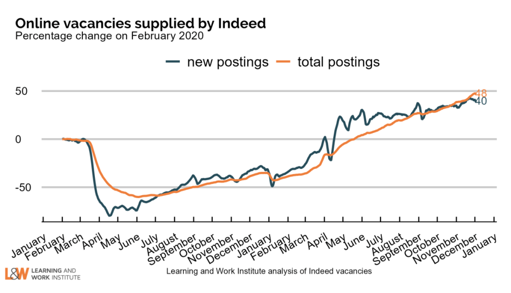 The number of vacancies remains at record levels, and the number of postings supplied to Indeed is almost 50% above pre-pandemic levels.