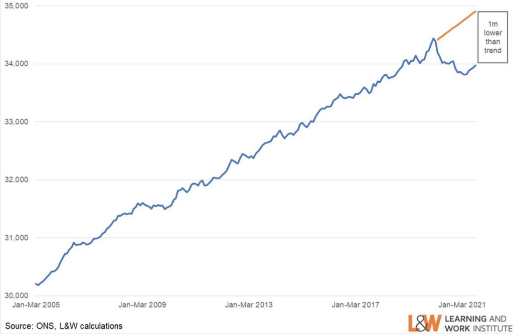 Our analysis shows there are around 1 million fewer economically active people (either employed or unemployed) than if pre-pandemic trends had continued. One third is the result of a lower population, two third due to people stopping looking for work (growth in economic inactivity).