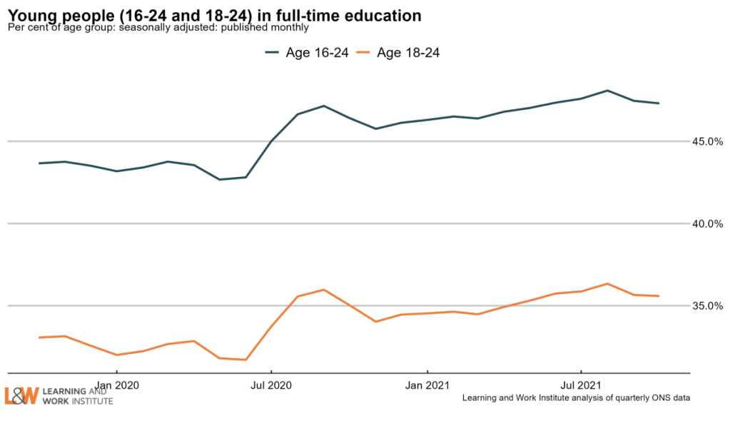 There have been rises in the number of young people staying in full-time education through the pandemic. This can be a sensible response to a tough labour market and, if the education is high quality, helps tackle some of our skills shortfalls with other countries. Overall, though, support for young people remains too disjointed: we argue for a Youth Guarantee to offer all 16-24 year olds a job, training place or apprenticeship.