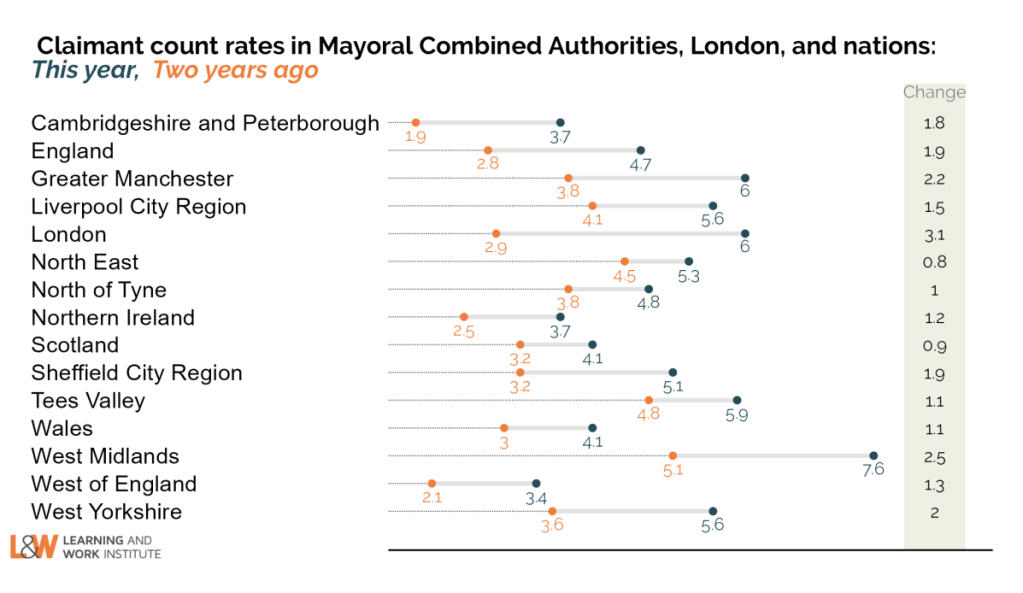 Of the combined authority areas, London and the UK nations, the claimant count was highest in the West Midlands before the pandemic (7.8%) and remains highest now (7.6%).