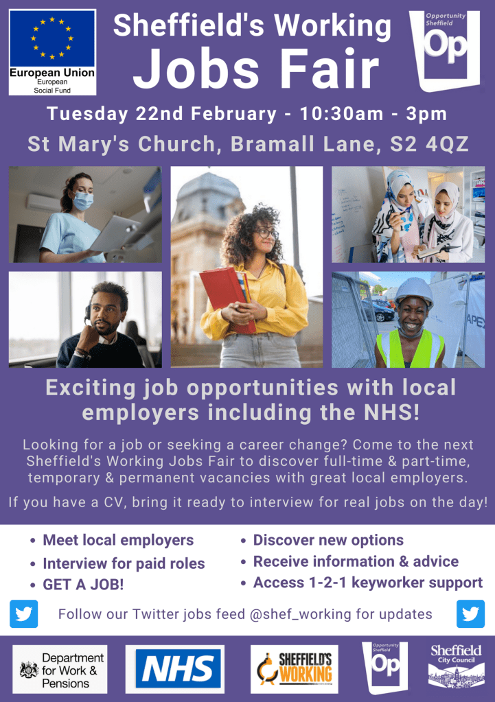 Opportunity Sheffield, the Employment and Skills service within Sheffield City Council, will be hosting the next Sheffield’s Working Jobs Fair on Tuesday 22 February 10:30am-3pm at St Mary’s Church, Bramall Lane.