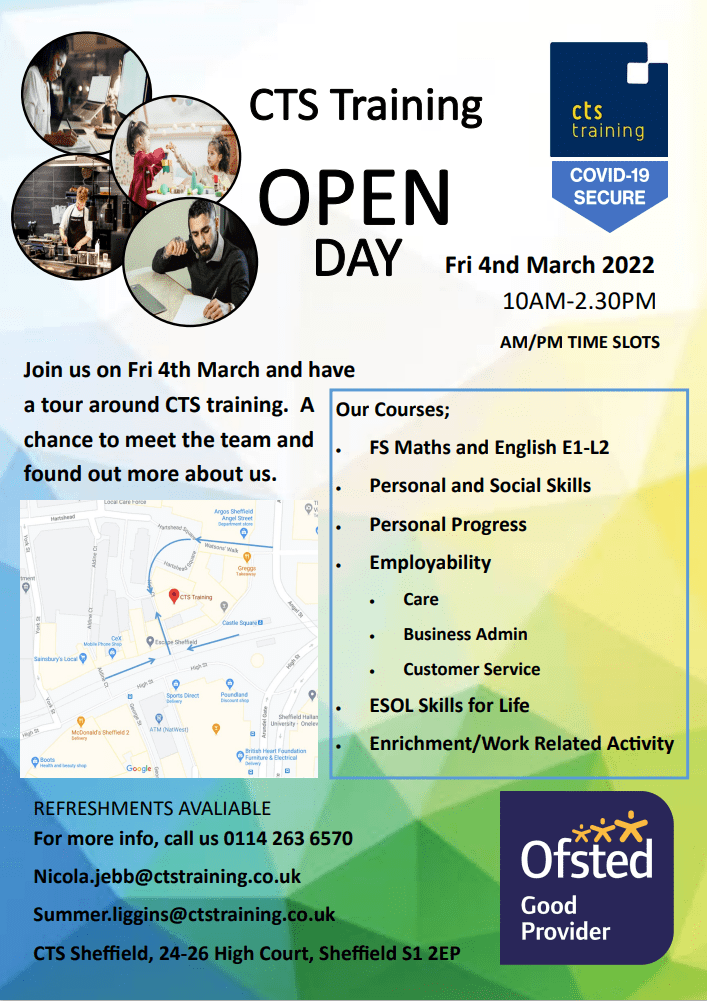 CTS Training will be hosting an open day on Friday 4 March between 10am-12pm and 12:30pm-14:30pm to advertise its 16-19 Study Programme.