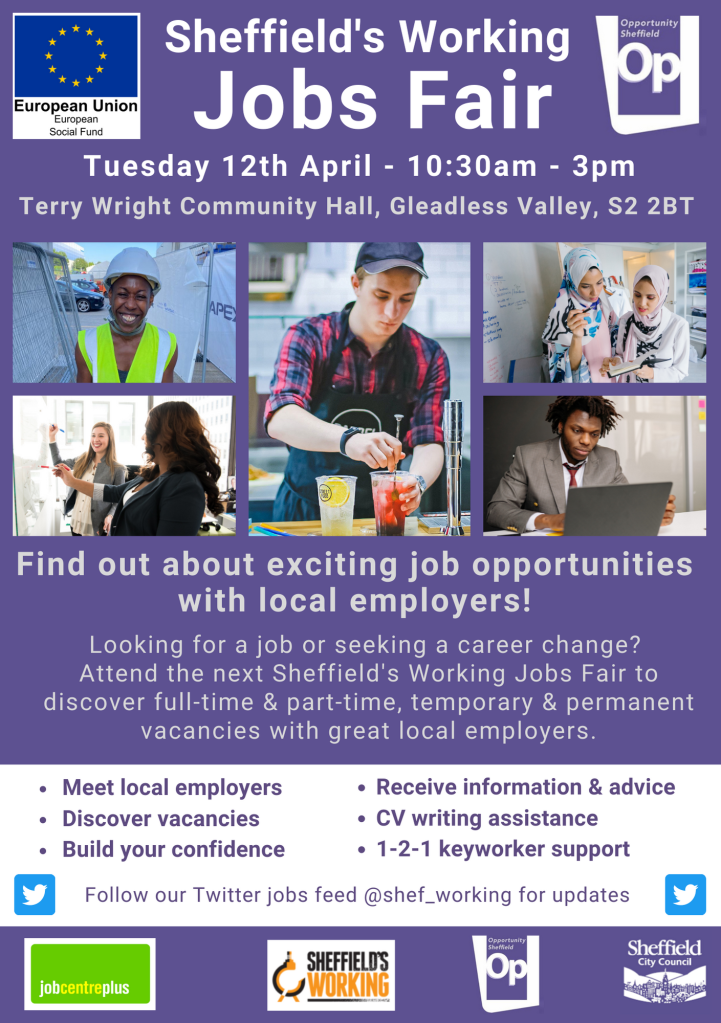 Opportunity Sheffield, the Employment and Skills service within Sheffield City Council, will be hosting the next Sheffield’s Working Jobs Fair on Tuesday 12 April 10:30am-3pm at Terry Wright Community Hall, Gleadless Valley, S2 2BT.