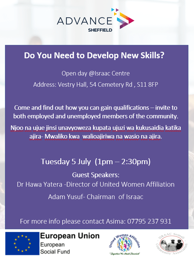 Israac (Israac Somali Community Association) invites you to attend an open day for training/skills development at Vestry Hall on Tuesday 5 July.