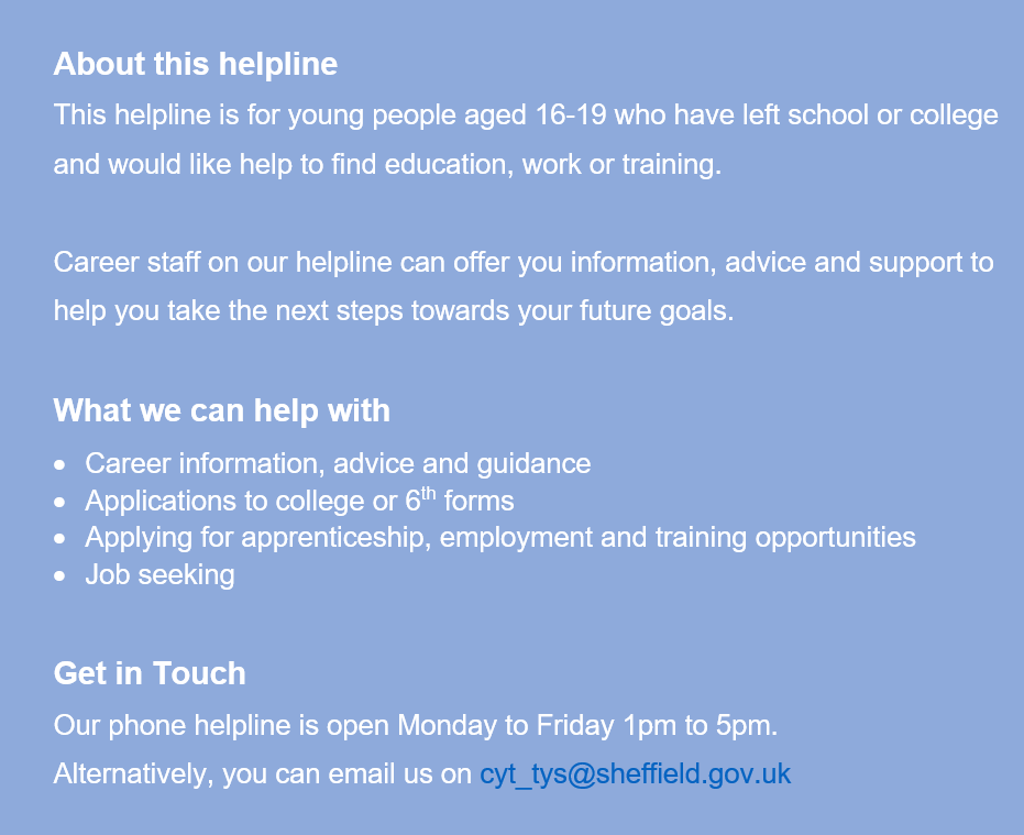 Sheffield City Council Community Youth Team offers Careers Helpline for 16-19s Opportunity Sheffield City Council June 20, 2022 1 Minute See below for details of Sheffield City Council’s Careers Helpline for 16-19s, overseen by the Community Youth Team: Share this: Click to share on X (Opens in new window) X Click to share on Facebook (Opens in new window) Facebook Like Loading... Related Published June 20, 2022