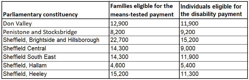 Table 3: Estimated number of families eligible for the means-tested benefit Cost of Living Payment and number of individuals eligible for the disability Cost of Living Payment by Westminster Parliamentary Constituency