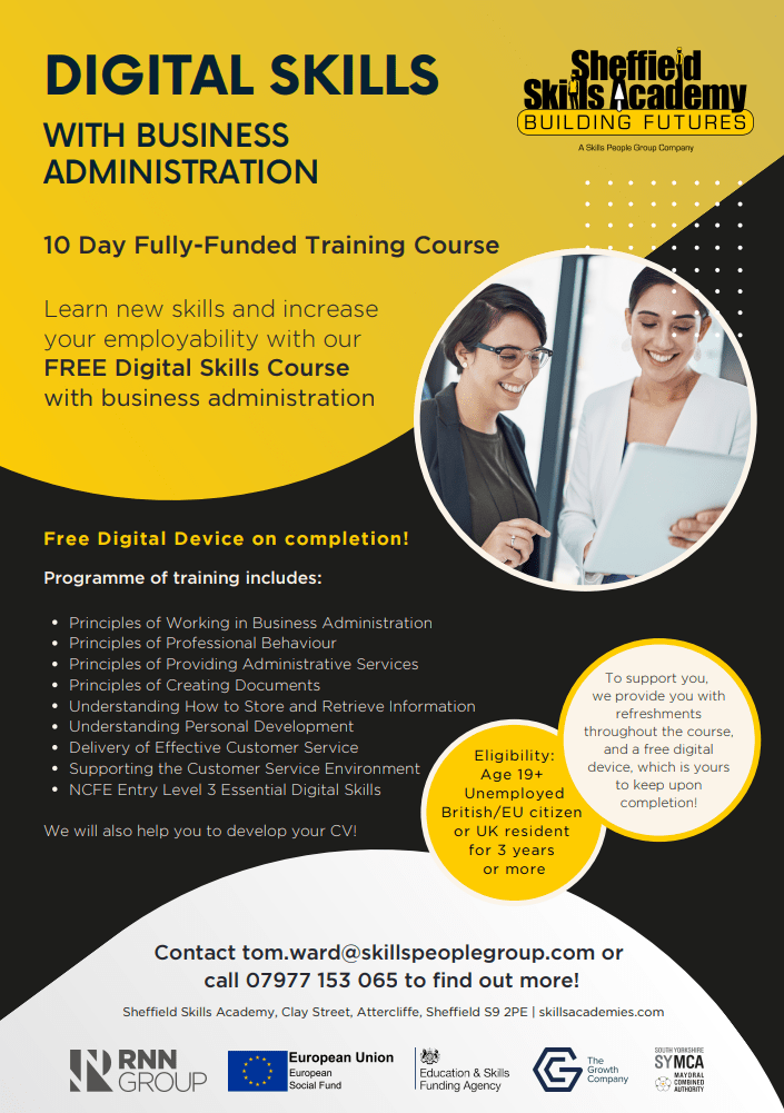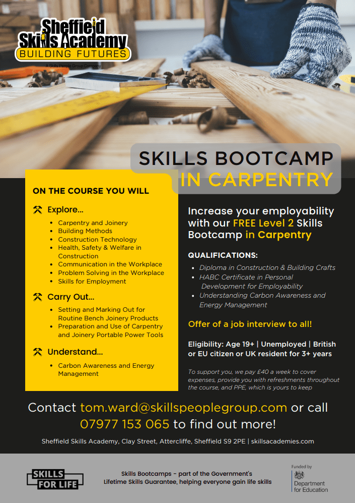 Sheffield Skills Academy is seeking referrals for a series of courses, including Introduction to Construction, Digital Skills with Business Administration, and its Plastering, Carpentry and Painting & Decorating skills bootcamps.