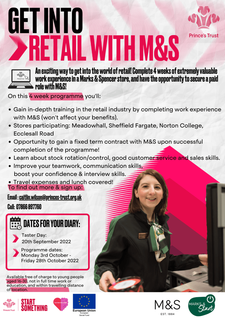 The Prince’s Trust is seeking referrals for its Get Into Retail with M&S programme, which will be delivered in Sheffield this October in partnership with high street retailer Marks & Spencer.