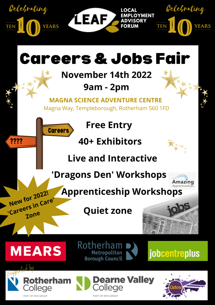 A careers fair will take place at Magna Science Adventure Centre, Templeborough, Rotherham on Monday 14 November. See below for further details: