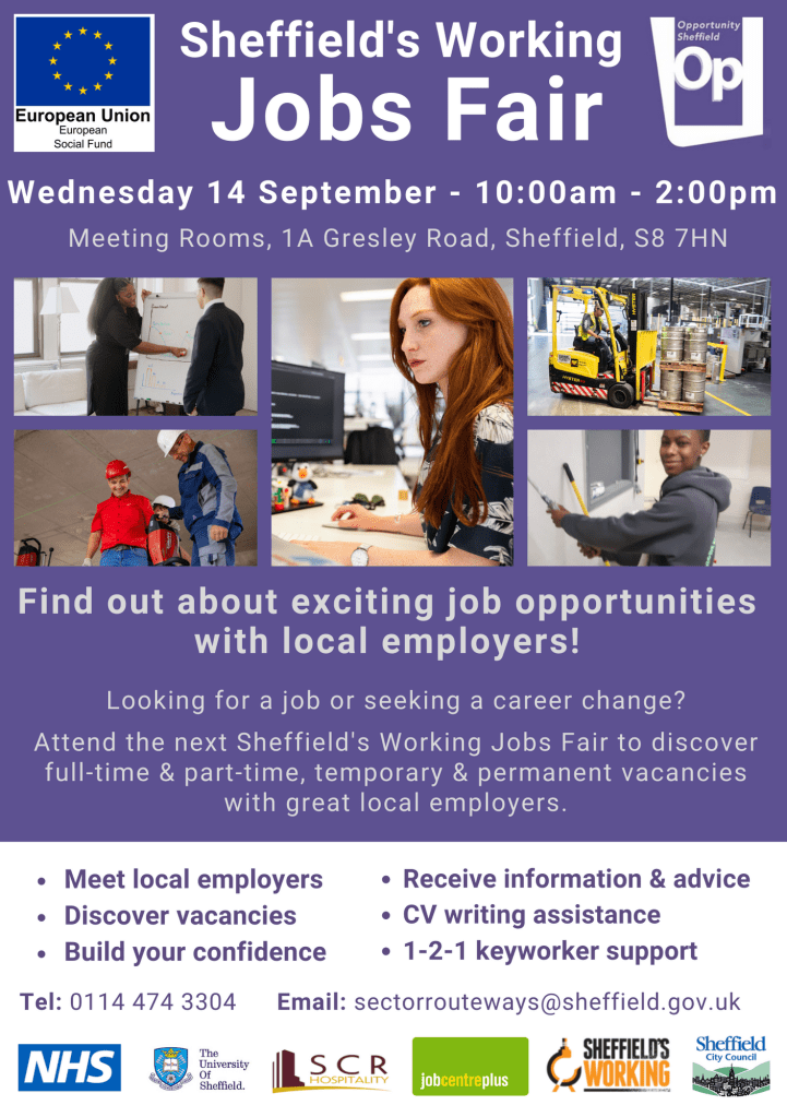 The next Sheffield’s Working Jobs Fair, organised by Opportunity Sheffield in partnership with Jobcentre Plus, will take place at Gresley Road Tenants Meeting Rooms, Lowedges on Wednesday 14 September (10am-2pm)