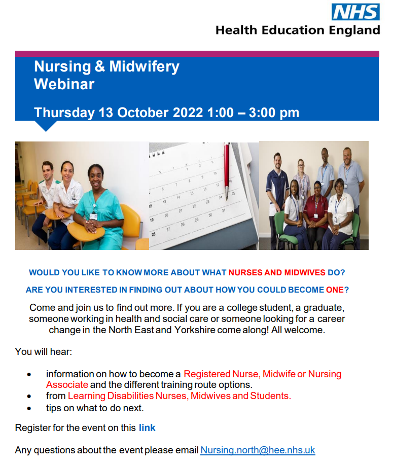 Find out about careers in Nursing & Midwifery; webinar on Thurs 13 Oct Opportunity NHS September 28, 2022 1 Minute Share this: Click to share on X (Opens in new window) X Click to share on Facebook (Opens in new window) Facebook Like Loading... Related Published September 28, 2022