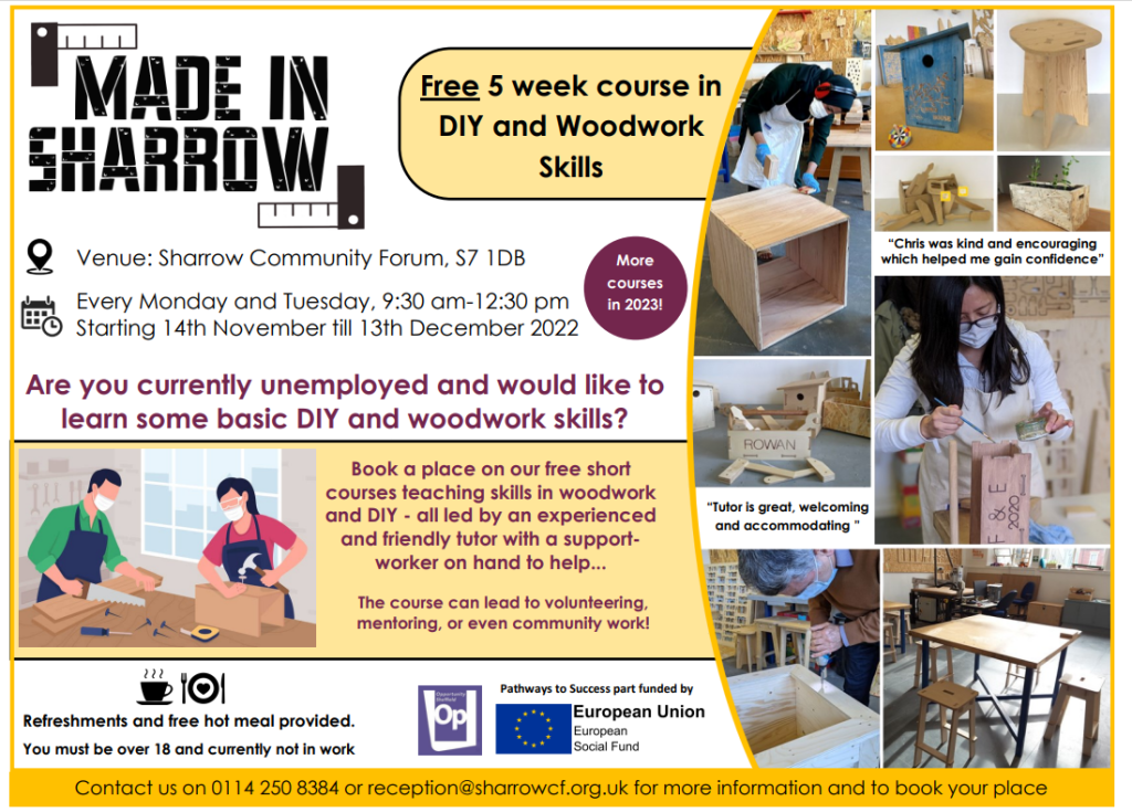 Made in Sharrow woodwork course returns for 2022-23 Opportunity Sharrow Community Forum October 31, 2022 1 Minute Share this: Click to share on X (Opens in new window) X Click to share on Facebook (Opens in new window) Facebook Like Loading... Related Published October 31, 2022