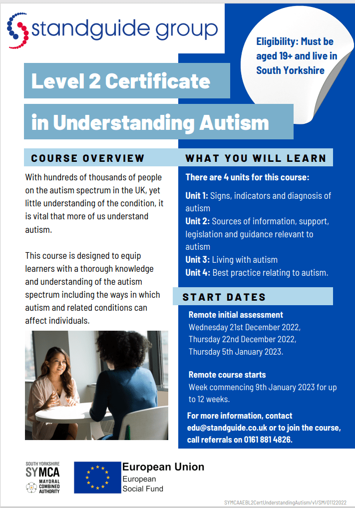 L2 Cert in Understanding Autism course with Standguide; start dates in Dec & Jan Opportunity Standguide December 12, 2022 1 Minute Share this: Share on X (Opens in new window) X Share on Facebook (Opens in new window) Facebook Like Loading... Related Published December 12, 2022