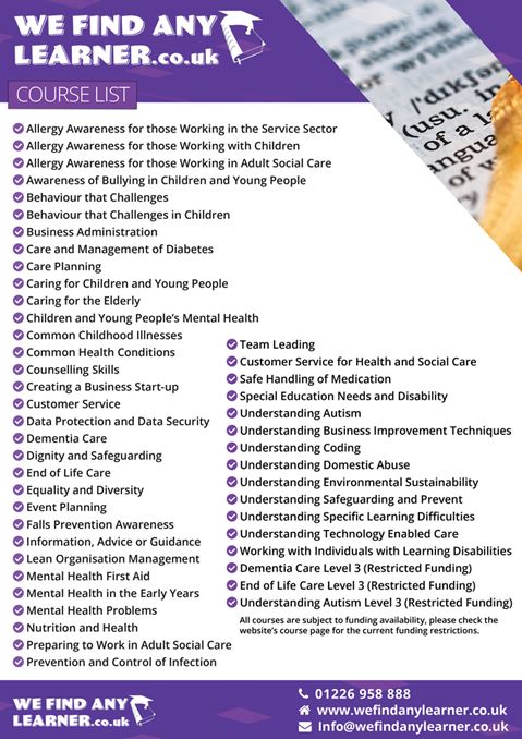 Thanks to government funding, We Find Any Learner is offering free, nationally accredited distance learning courses. These courses aim to support personal development, confidence, and to improve your CPD from the comfort of your own home or workplace.