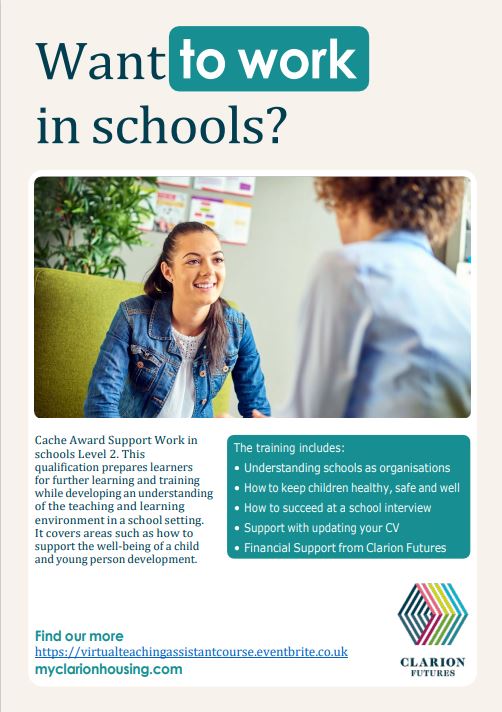 Clarion Futures Jobs and Training is delivering a free online teaching assistant course, beginning on Tuesday 17 January. The qualification is the NCFE CACHE Level 2 Award in Preparing to Work in Schools and will ready participants for further learning and training whilst developing an understanding of the teaching and learning environment in a school setting. It covers areas such as how to support the well-being of a child or young person and their development.