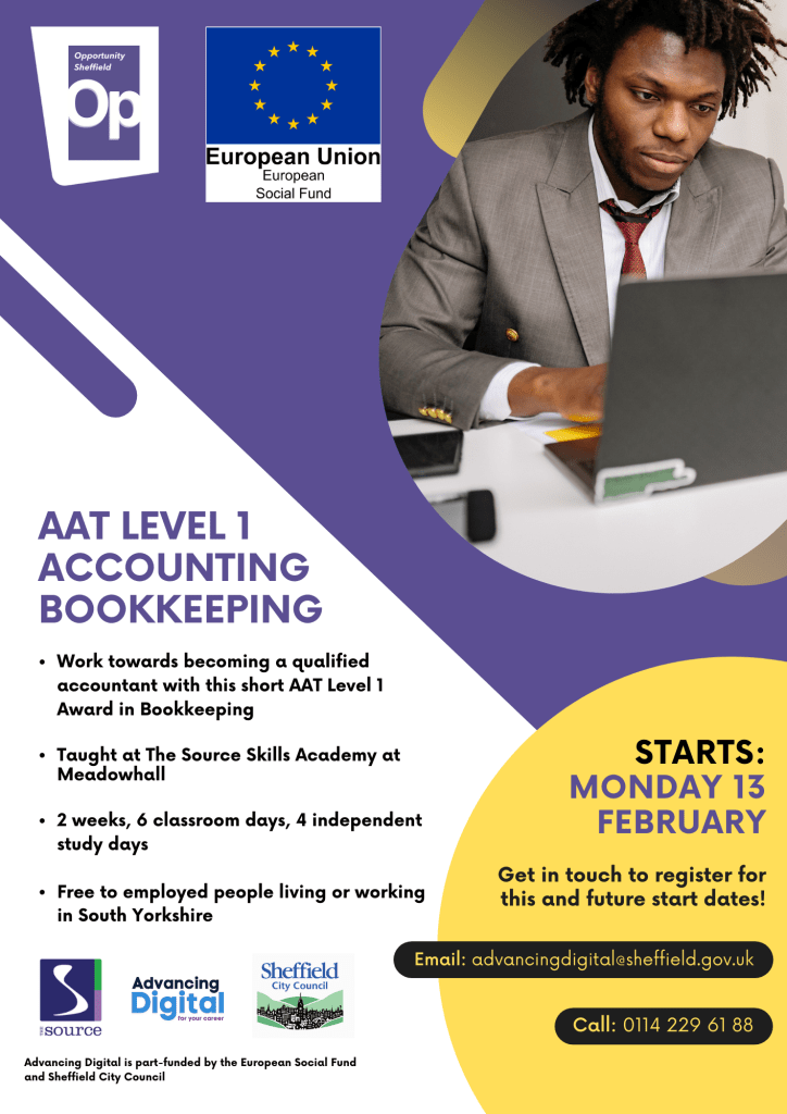 Accounting and Bookkeeping Level 1 starts on Monday 13 February at The Source Skills Academy in Sheffield.