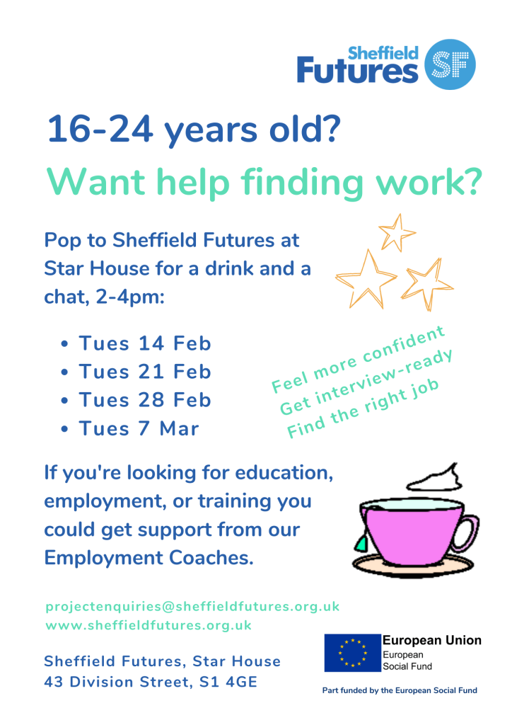 Sheffield Futures is running a series of Employability Support drop in sessions beginning on Tuesday 14 February. Sessions will take place every week from 2pm-4pm for a duration of 4 weeks.