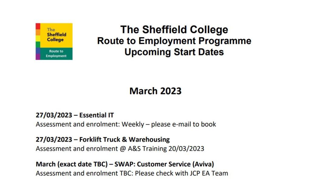Upcoming start dates for Sheffield College’s Route to Employment programme Opportunity Sheffield College March 14, 2023 1 Minute Share this: Click to share on X (Opens in new window) X Click to share on Facebook (Opens in new window) Facebook Like Loading... Related Published March 14, 2023