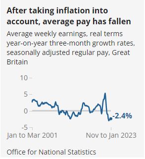 Regular pay for UK employees fell in the three months to January 2023 after accounting for the rising cost of living.