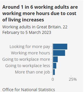 Separate data collected between 22 February and 5 March 2023 show around one in six adults in Great Britain (17%) say they are working more hours than usual because of the rising cost of living.