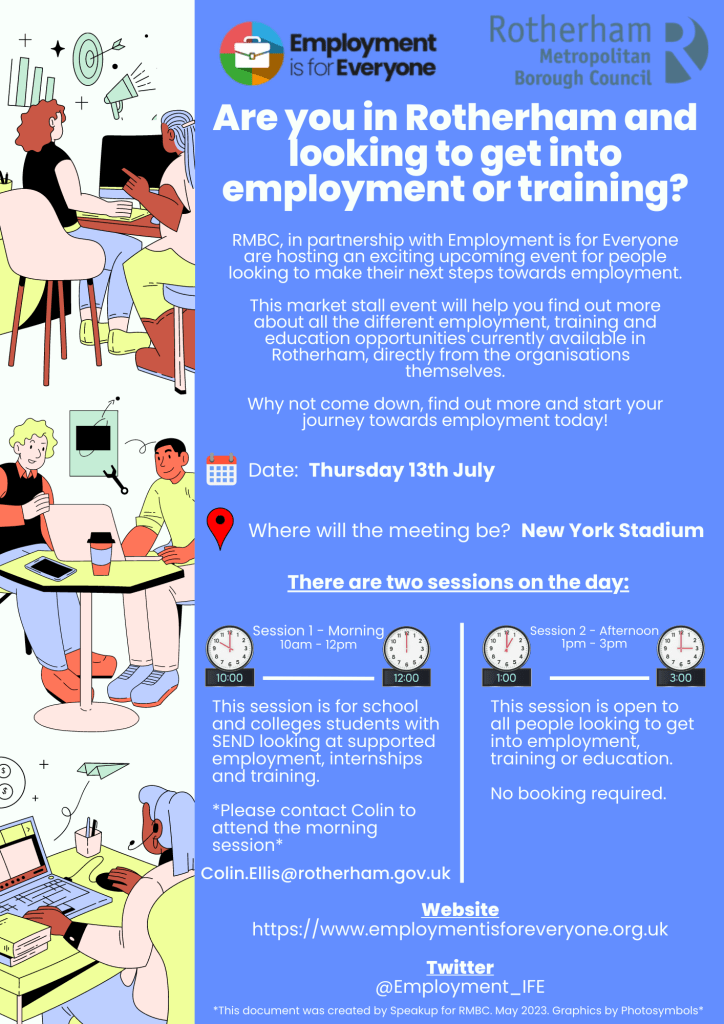 Employment is for Everyone, in partnership with Rotherham Metropolitan Borough Council, is hosting a market stall employment and training event Thursday 13 July. The event is for people looking to make their next steps towards employment and there will be many support organisations there to share information about all the different employment, training and education opportunities currently available in Rotherham.