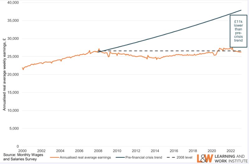 It’s also true that nominal wages are rising at relatively fast rates: 6.5% in the year to April 2023, though still below inflation. But of course the bigger picture is of average real wages barely growing in 15 years, leaving them £11,000 below their levels if pre-financial crisis trends had continued.