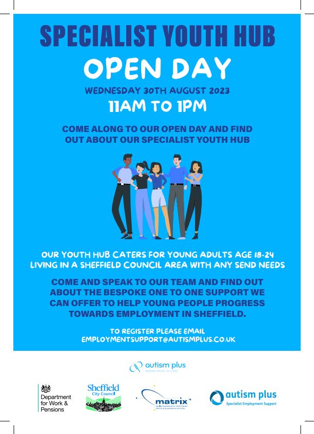 Autism Plus is holding a SEND Youth Hub open day on Wednesday 30 August from 11am-1pm.