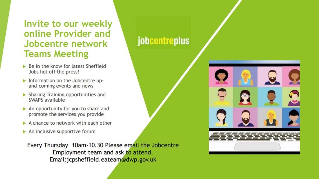 Jobcentre Plus invites individuals at attend it’s weekly online Provider and Jobcentre Network meetings. Meetings will take place every Thursday from 10am-10:30am online.