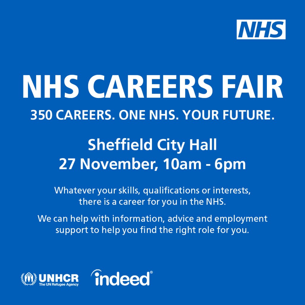 The NHS is holding a Refugee Career Education event on Monday 27 November from 10am-6pm at Sheffield City Hall, Barkers Pool, S1 2JA.