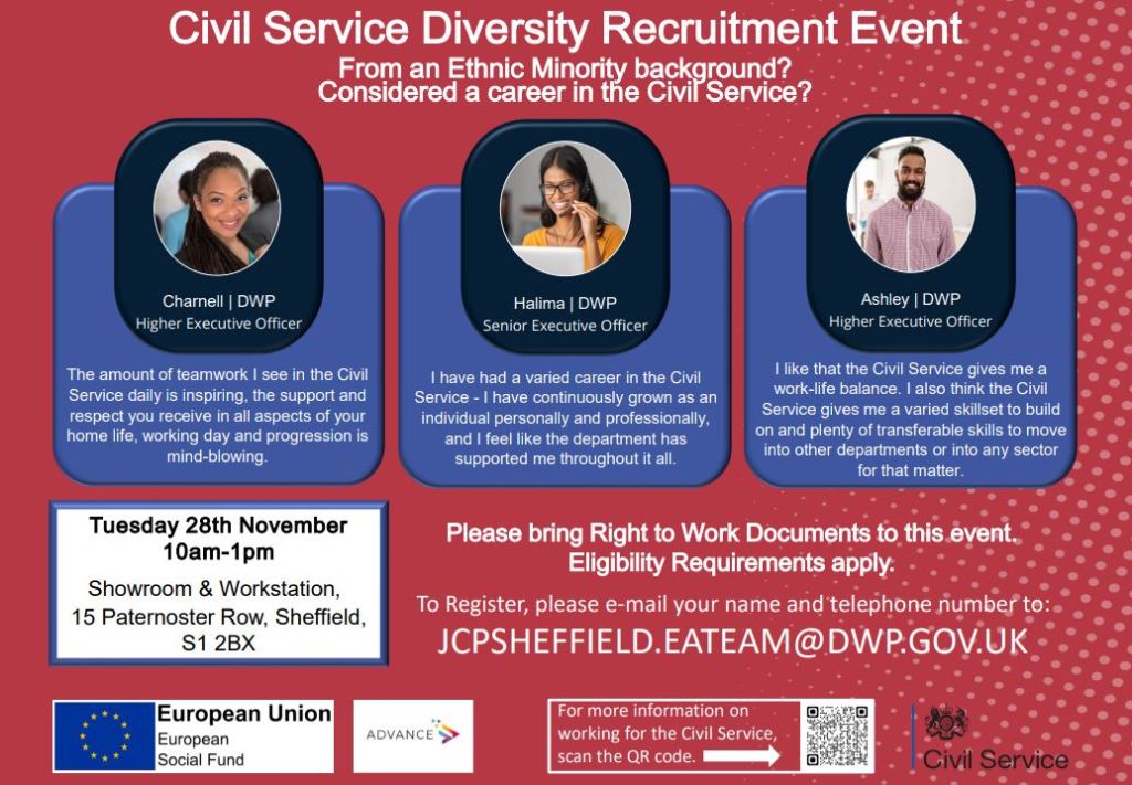 The Civil Service is seeking to ensure that it’s workforce is more representative of the communities that it serves and is holding a recruitment event on Tuesday 28 November focussed on promoting wider diversity of recruitment from ethnic minority groups. The event will take place at The Showroom & Workstation, Paternoster Row, Sheffield, S1 2BX from 10am-1pm.