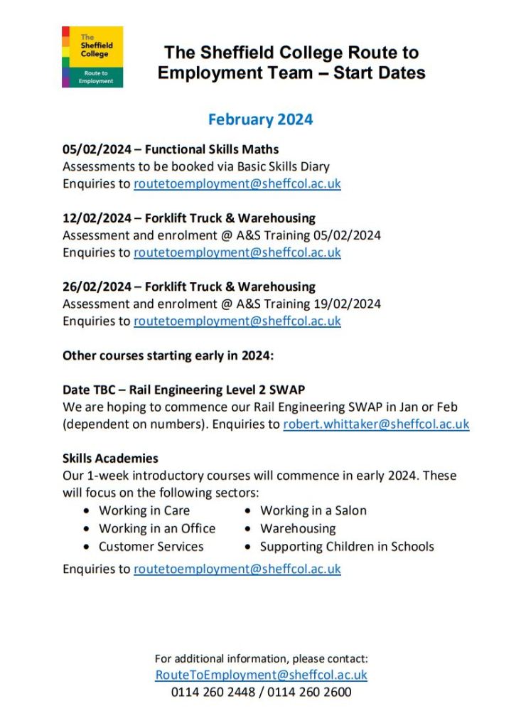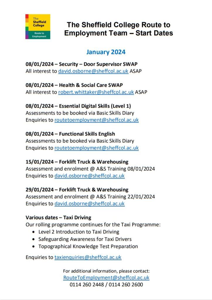 Sheffield College Route to Employment course start dates – Jan 24 Opportunity Sheffield College December 1, 2023 1 Minute Share this: Share on X (Opens in new window) X Share on Facebook (Opens in new window) Facebook Like Loading... Related Published December 1, 2023