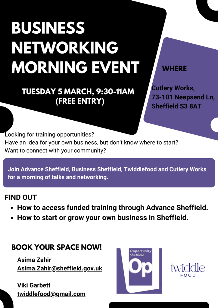 Join our Advance Sheffield team, Twiddle Food and Business Sheffield for a Business Networking Morning at Cutlery Works on Tuesday 5 March 2024, 9:30am – 11am.