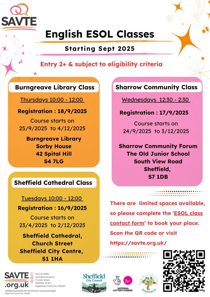 SAVTE’s English ESOL courses start again from 16 September onwards at three Sheffield locations.