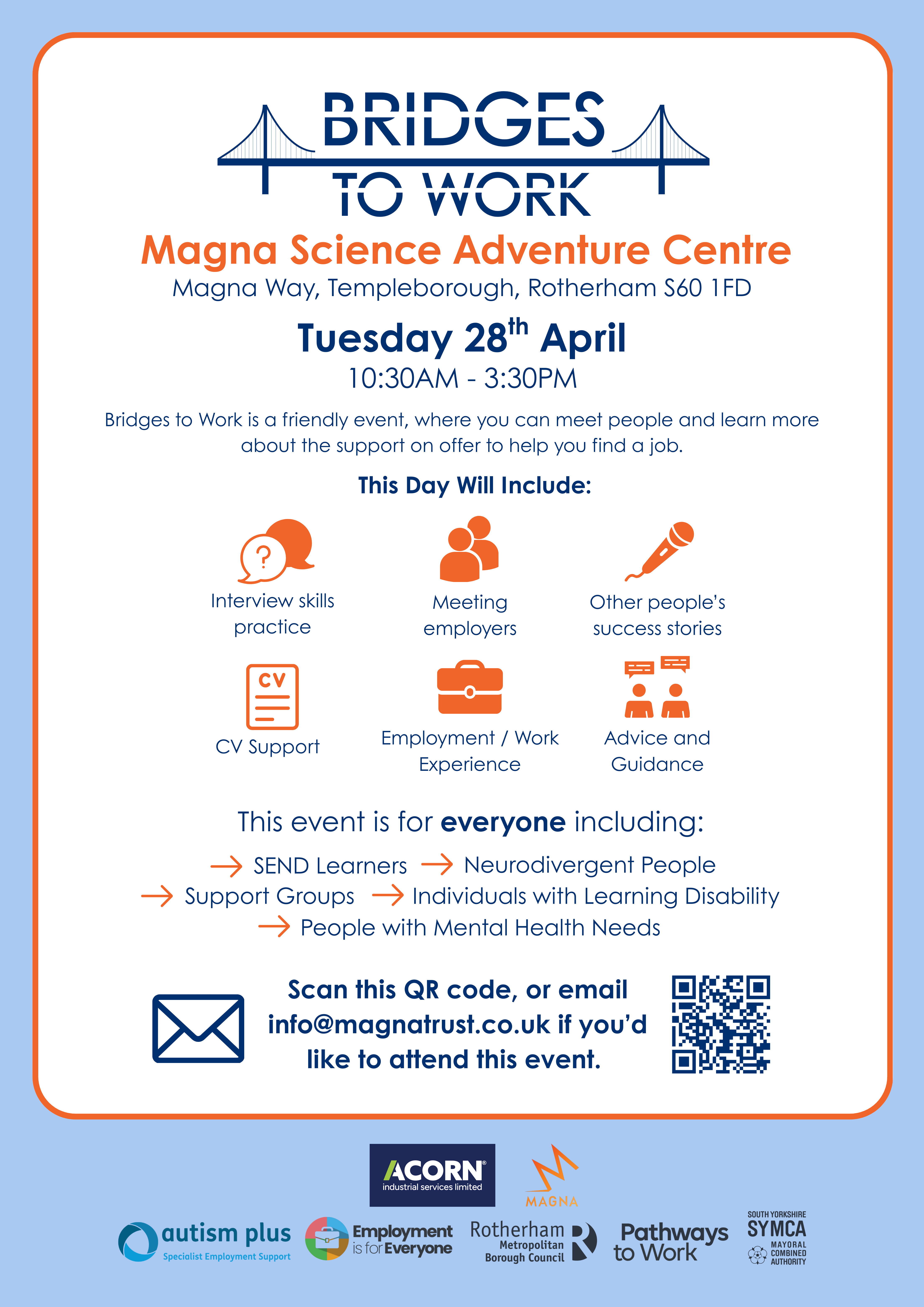 Bridges to Work is an event to help people into work, taking place at Magna Science Adventure Centre on Saturday 28 April 2026, from 10:30am to 3:30pm.